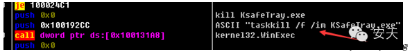 该样本运行后动态获取自身代码,随后进行提权操作,关键功能为枚举杀毒软件金山卫士进程名KSafeTray.exe。如果存在此进程,则终结进程。