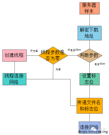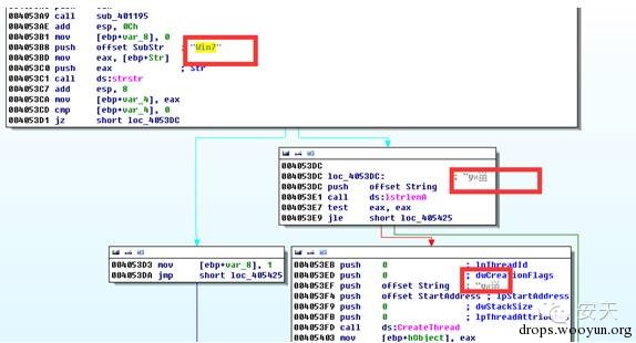 该黑客服务器上线不到2个小时即被安天CERT捕获到。该样本首先解密下载服务器的地址,随后判断该样本是否带参数运行及参数是否包括“Win7”字符串,如果不包括或者不带参数运行则进入创建具有下载功能的线程,进入创建线程时判断传递给线程的参数是否为空,如果不为空则进入线程创建过程,如下图所示。