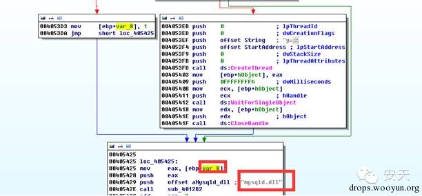 如果恶意代码带参数且包含“Win7”字符串时,则恶意代码直接跳过线程代码创建过程,将文件名称和标志位传递给连接服务器函数,随后进行重新连接该服务器地址,重新下载1011.exe文件并保存在C:\Windows\AppPatch目录下起名为“mysqld.dll” 运行。