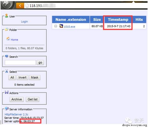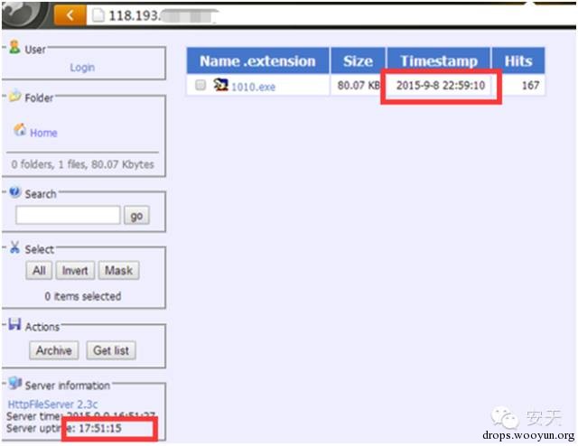 当恶意代码连接该服务器端口时,服务器端口失效。而在安天CERT分析人员连接该IP时发现一个轻型服务器,上面有一个恶意代码(1010.exe)
