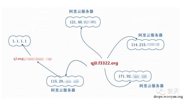 通过进一步关联分析,发现在安天蜜罐系统中另一个样本所链接的地址也是使用Http File Server搭建的服务器。服务器域名为qj0..,对此安天CERT对该域名进行几天跟踪发现该域名更换过4次IP(如下图所示),且服务器均为阿里云提供。采取动态域名、利用阿里云提供服务器,这两个手法相互结合更加提高了恶意团伙的隐蔽性。黑客购买了多个阿里云服务器用来传播恶意代码,且时常更换IP,并用IP绑定其他域名等方式来扩大恶意代码传播范围,同时将自己隐藏的更深。