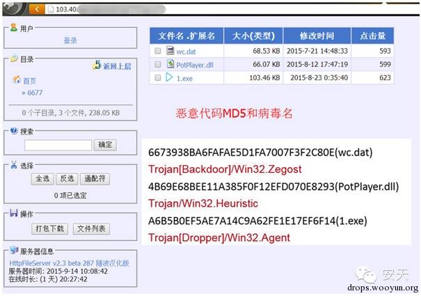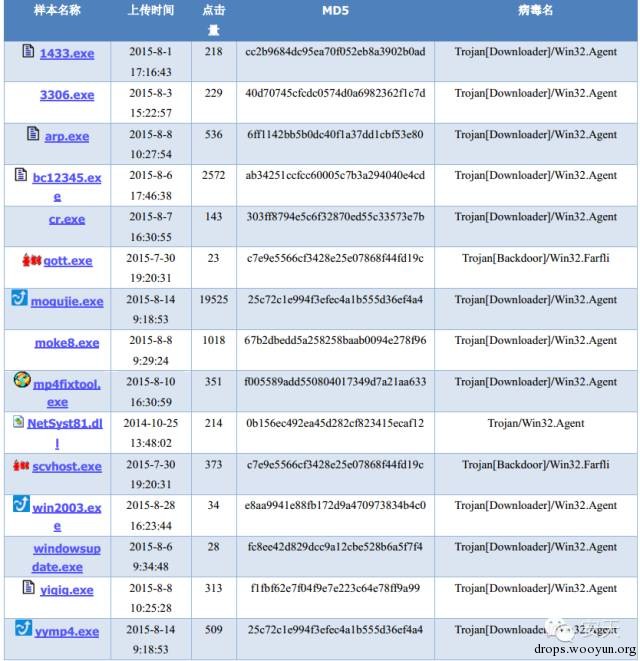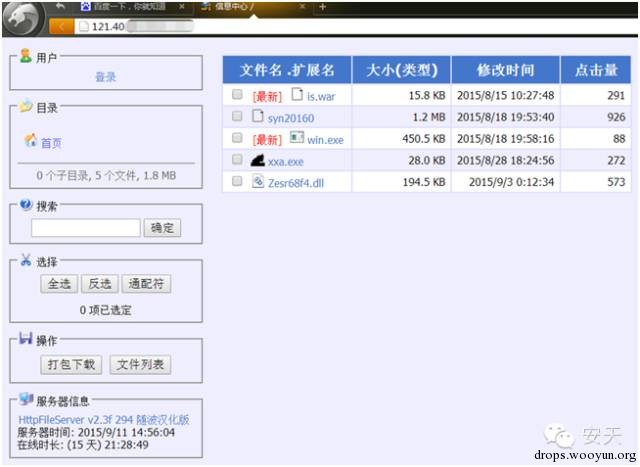 安天CERT于9月7日捕获到了另外一种类似恶意代码下载服务器地址,该服务器在捕获的时候点击量已经近万。服务器上的软件几乎均为恶意代码,恶意代码功能多为后门和下载者,恶意代码功能列表详见下方表格。