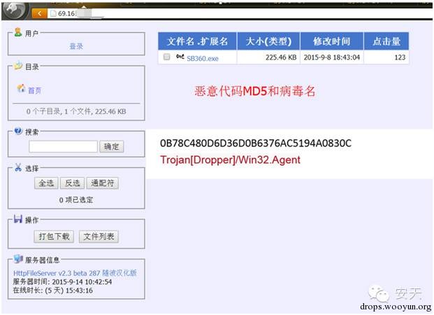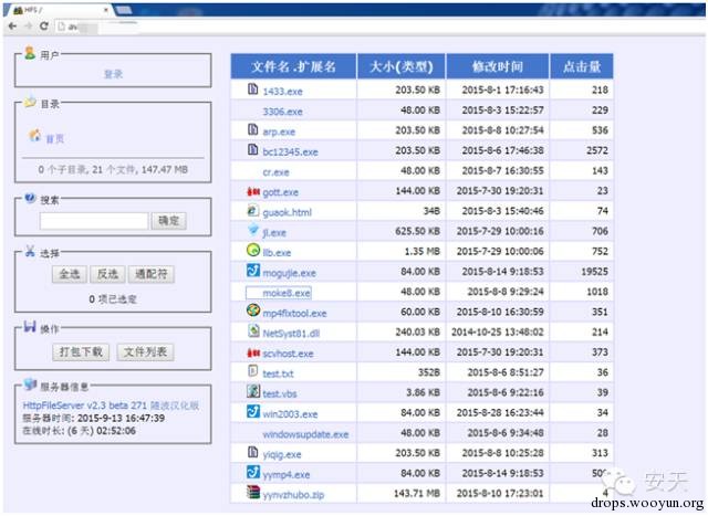 近期,安天第三代蜜罐捕风系统捕获到一个下载者样本。该样本运行后访问一个由黑客搭建的轻型文件服务器(Http File Server)。通过使用捕风系统进行追溯与关联分析,分析人员发现目前有很多使用HFS搭建的服务器,通过对其中一个下载服务器进行监控,其在线6天的总点击量近3万次,可见其传播范围极广。该软件的“傻瓜式”教程颇受低水平的攻击者喜爱,同时由于其架设方便,便于传播等特点,已被黑客多次恶意利用。经过安天CERT分析人员进行关联与分析发现,目前这种轻型服务器工具已普遍流行。