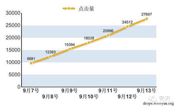 安天CERT分析人员跟踪该服务器一周时间发现,总点击量呈线性增长,几乎每天增加3000的点击量。如下图所示:
